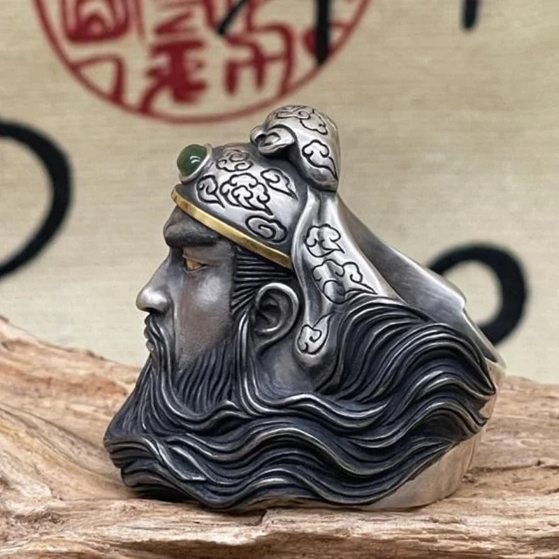 Retro-style silver ring with Chinese motif: Warrior Guan Yu