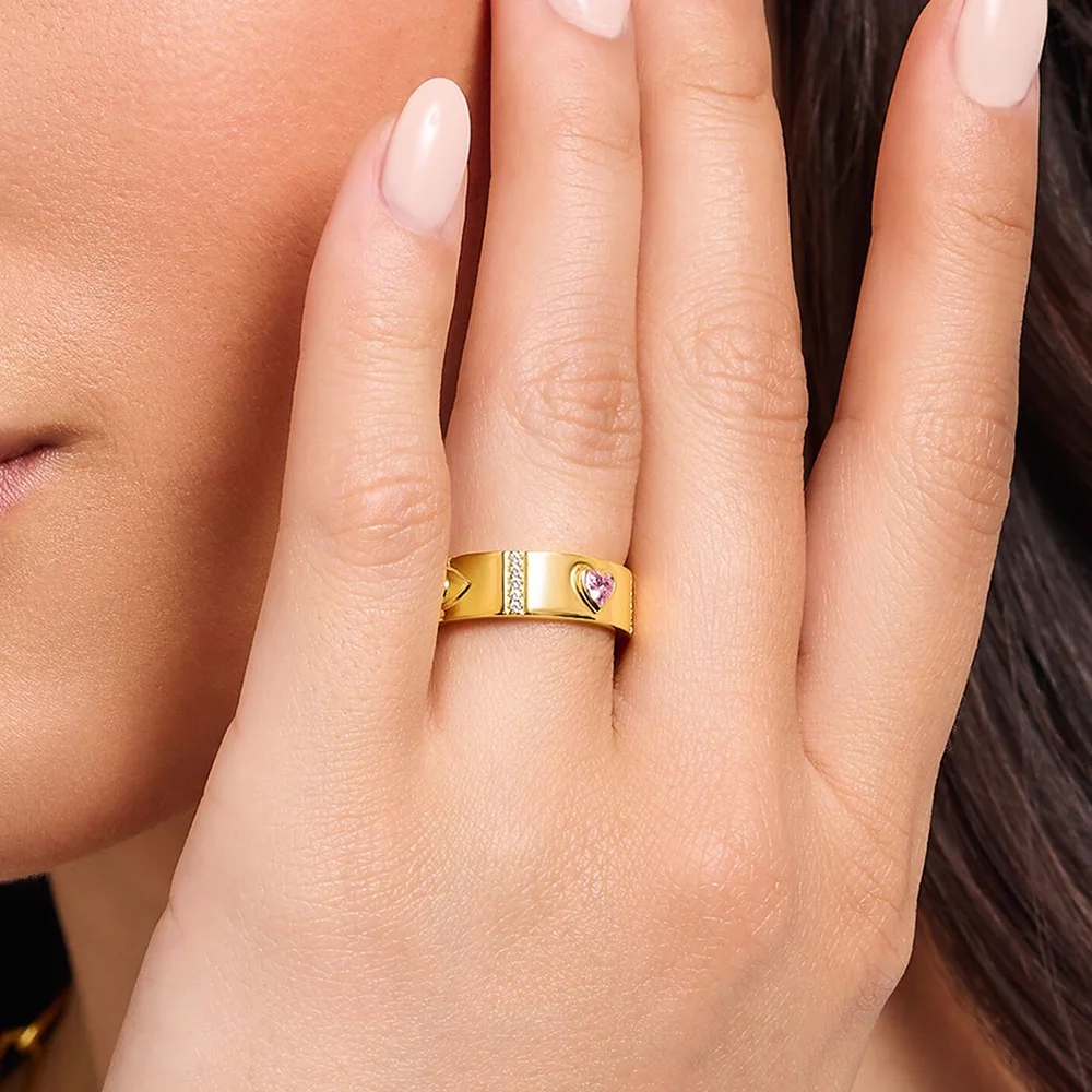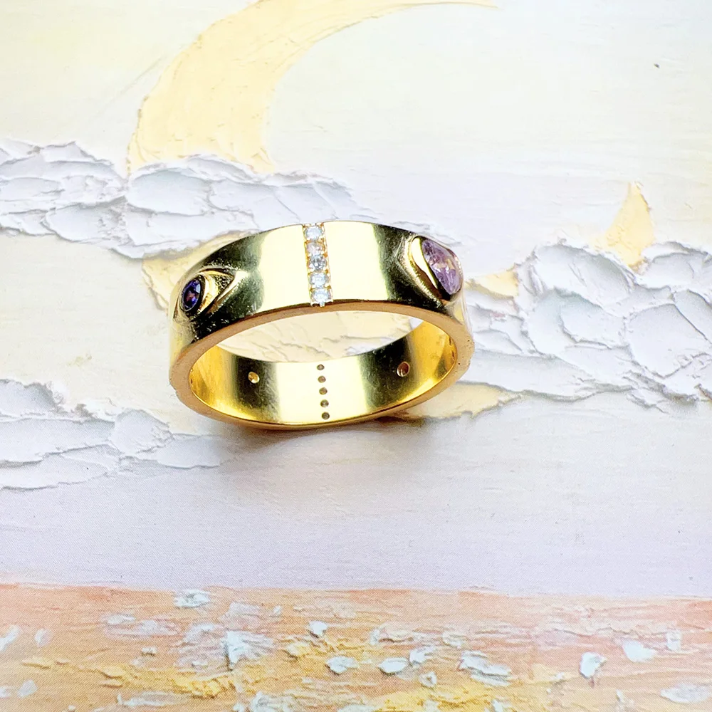 Kosmiczne talizmany: ten pierścień jest bogaty w detale i wykonany z wysokiej jakości srebra próby 925, platerowanego 18-karatowym żółtym złotem. Ozdobiony jest fasetowanymi, trójwymiarowymi motywami, które podobno przynoszą szczęście. Oko, serce, słońce i gwiazdy są wysadzane kamieniami w różnych kolorach i rozmiarach. Białe cyrkonie w oprawie pavé wizualnie oddzielają poszczególne motywy. Pierścień jest dostępny w różnych rozmiarach i stanowi idealny symboliczny prezent dla bliskiej osoby.