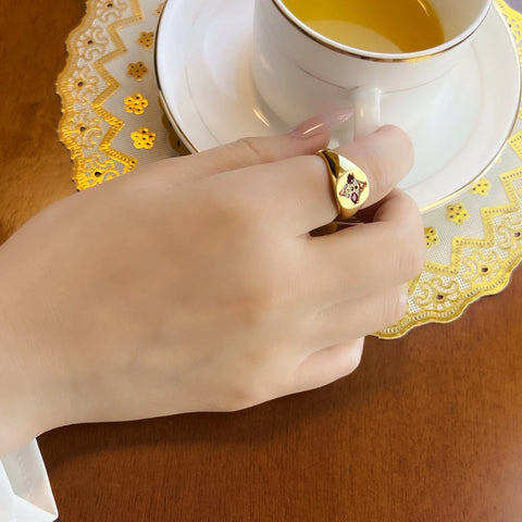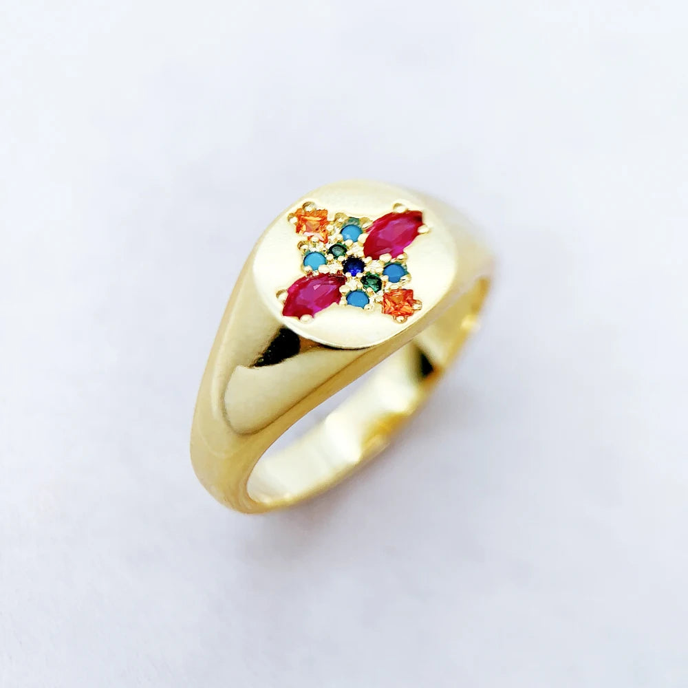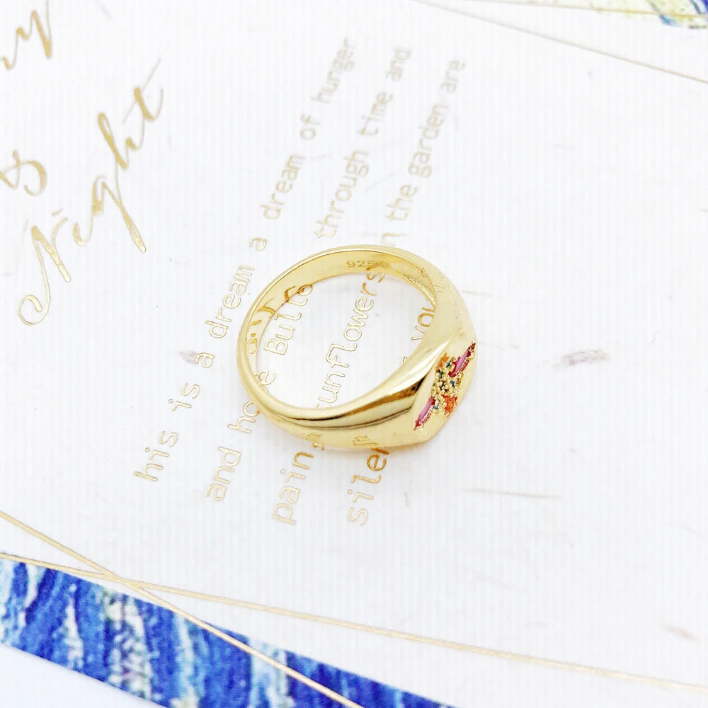 Odkryj ponadczasowy urok i śmiałą elegancję tego sygnetu zdobionego lśniącymi kamieniami. Ten wyjątkowy element biżuterii, wykonany ze srebra próby 925, urzeka delikatnym wzornictwem i kolorowymi kamieniami, nawiązującymi do tętniącego życiem piękna europejskiej przyrody. Pięknie wypolerowana, pozłacana powierzchnia doskonale eksponuje lśniące kamienie szlachetne, tworząc efektowny kontrast, który przyciąga wzrok. Ten pierścionek, zarówno męski, jak i wyrafinowany, idealnie podkreśli Twój osobisty styl – zarówno na oficjalne okazje, jak i na co dzień. Odważ się i wzbogac swoją kolekcję biżuterii o ten ręcznie wykonany element. To idealny wybór dla osób, które chcą wyróżnić się z tłumu elegancją.